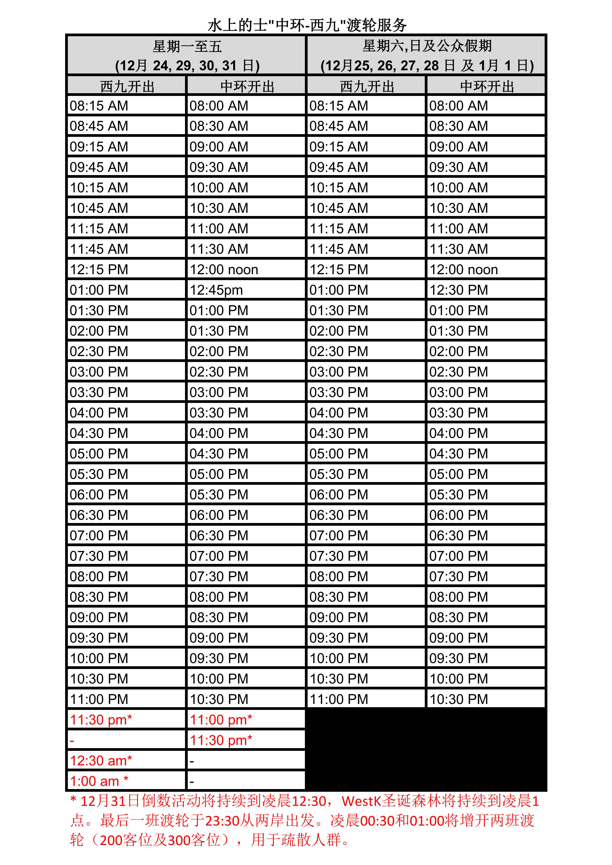 因应节日人流众多,为提供更好的渡轮服务,往来中环西九航线班次进行以下调动